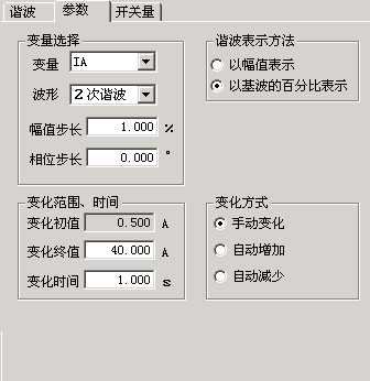 切換至“參數”頁面,選擇IA為變量,波形為“二次諧波”,并設幅值步長為1%,選擇“手動變化”方式。設置好的參數如上圖所示。開始試驗,按步長逐步減小變量致保護動作。將動作時IA的二次諧波百分比值與整定的制動系數對照。