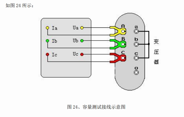 容量測試儀配有三把測試鉗(黃、綠、紅),每只鉗子分別引出兩根測試線,一根粗線、一根細線,粗線接到儀器面板上容量測試端子對應顏色的電流端子(Ia、Ib、Ic),細線接到儀器面板上容量測試端子對應顏色的電壓端子(Ua、Ub、Uc),將鉗頭按顏色分別夾在被試變壓器的高壓側各相接線柱上,變壓器的低壓側要用專用短接線良好短接。